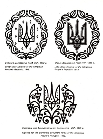 В історичних джерелах описана зустріч Михайла Грушевським з геральдистами. Обговорювались різні варіанти: і ідея взяти герб Гетьманщини без змін, і «золоті звізди на синім тлі, по числу земель Нової України», і Галицький лев, і Архангел Михаїл, і золота буква У. Сам Грушевський пропонував зробити основним символом золотий плуг на синьому тлі, як символ «творчої праці, мирної праці». Зустріч закінчилася нічим.