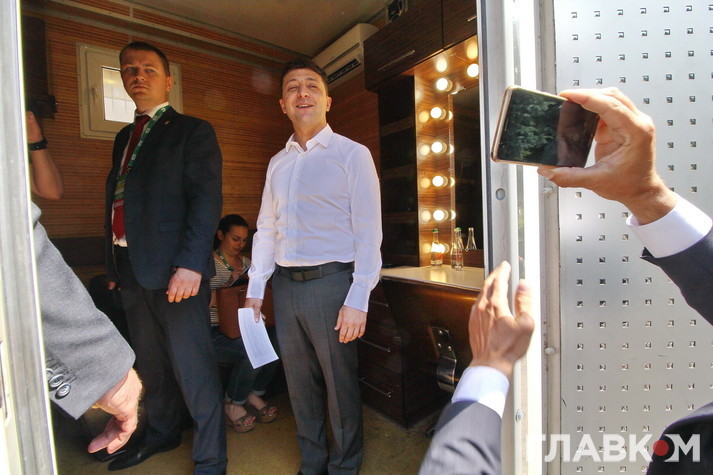 Зеленський зі свитою пройшли пішки і зачинились в фургоні з написом «Телебачення». Взагалі, у багатьох присутніх складалося враження, що ситуація відбувається на знімальному майданчику – біля шатра стояло багато фур з таким само написом. І навіть з’їзд розпочався відліком секунд, які залишились до початку ефіру. Перед цим Зеленський несподівано запустив журналістів до себе в «гримерку», щоб показати, що там ніхто не складає ніяких таємних списків.