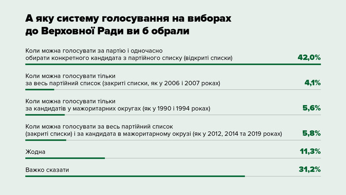 42% опитаних громадян підтримують виборчу реформу, яка дала можливість обирати народних депутатів за відкритими списками. Виборчу систему із закритими списками і мажоритарниками підтримують лише 5,8% опитаних громадян.