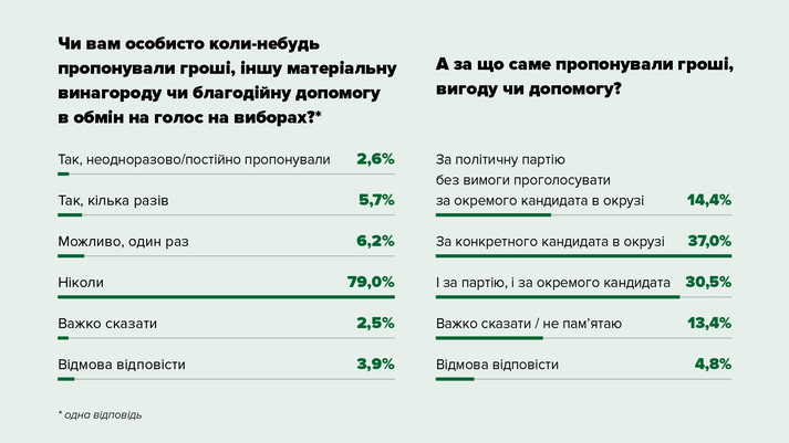 З-поміж тих опитаних, яким пропонували гроші за їхній голос, 37% зізналися, що це був підкуп на користь мажоритарника
