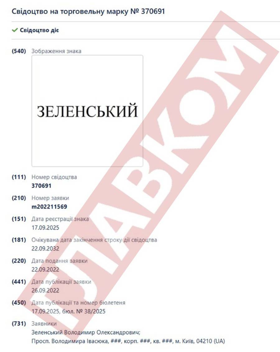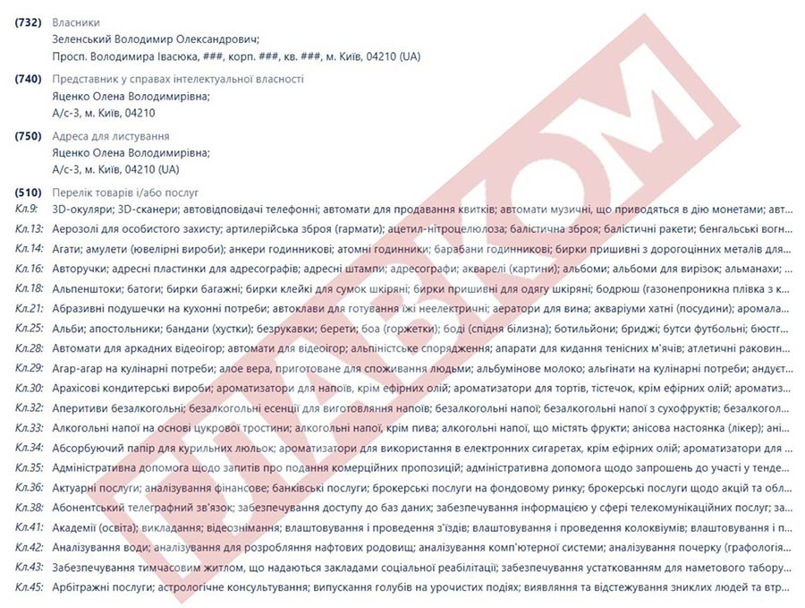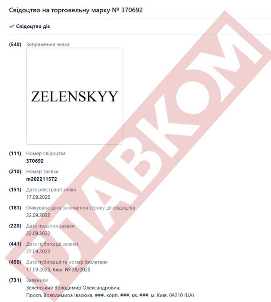Глава держави 17 вересня став власником торговельних марок «Зеленський» і Zelenskyy. Їх можна використовувати на низці товарів і послуг, серед яких аксесуари (наприклад, 3D-окуляри), вогнепальна зброя, продукти харчування.