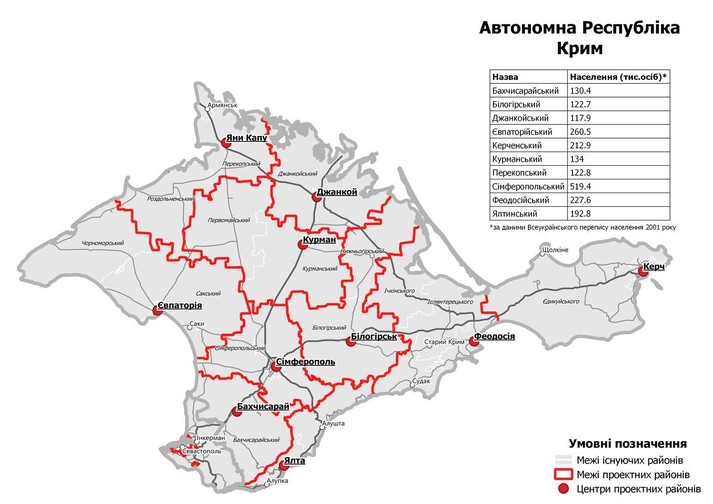 Варто зазначити, що ліквідація та утворення районів на тимчасово окупованих територіях Автономної Республіки Крим, Донецької та Луганської областей буде проводитися після повернення цих територій під загальну юрисдикцію України (відновлення територіальної цілісності України та відновлення повноважень органів державної влади України на відповідній території у порядку, визначеному законодавством України).
