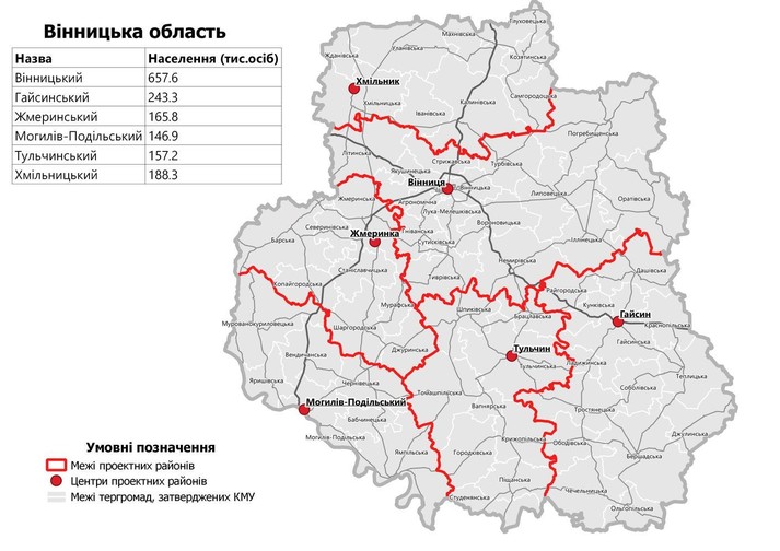 Хмільницький район (з адміністративним центром у місті Хмільник) у складі територій Глуховецької селищної, Жданівської сільської, Іванівської сільської, Калинівської міської, Козятинської міської, Махнівської сільської, Самгородоцької сільської, Уланівської сільської, Хмільницької міської територіальних громад, затверджених Кабінетом Міністрів України.