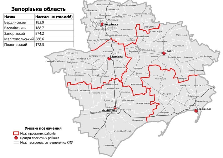 Пологівський район (з адміністративним центром у місті Пологи) у складі територій Більмацької селищної, Воздвижівської сільської, Воскресенської сільської, Гуляйпільської міської, Комиш-Зорянської селищної, Малинівської сільської, Малотокмачанської сільської, Молочанської міської, Оріхівської міської, Пологівської міської, Преображенської сільської, Розівської селищної, Смирновської сільської, Токмацької міської, Федорівської сільської територіальних громад, затверджених Кабінетом Міністрів України;