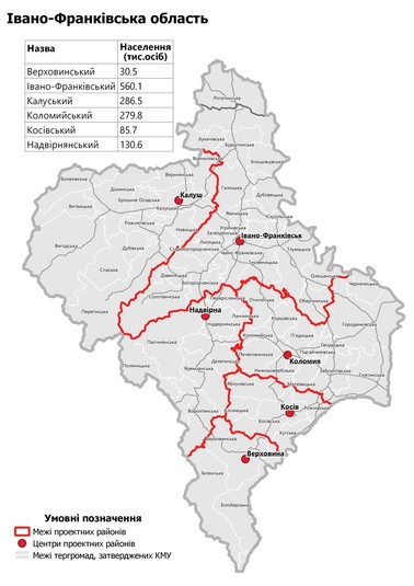 Івано-Франківський район (з адміністративним центром у місті Івано-Франківськ) у складі територій Більшівцівської селищної, Богородчанської селищної, Букачівської селищної, Бурштинської міської, Галицької міської, Дзвиняцької сільської, Дубовецької сільської, Єзупільської селищної, Загвіздянської сільської, Івано-Франківської міської, Лисецької селищної, Обертинської селищної, Олешанської сільської, Рогатинської міської, Солотвинської селищної, Старобогородчанської сільської, Тисменицької міської, Тлумацької міської, Угринівської сільської, Ямницької сільської територіальних громад, затверджених Кабінетом Міністрів України;