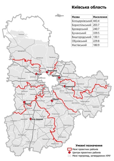 Білоцерківський район (з адміністративним центром у місті Біла Церква) у складі територій Білоцерківської міської, Володарської селищної, Гребінківської селищної, Ковалівської сільської, Маловільшанської сільської, Медвинської сільської, Рокитнянської селищної, Сквирської міської, Ставищенської селищної, Таращанської міської, Тетіївської міської, Узинської міської, Фурсівської сільської територіальних громад, затверджених Кабінетом Міністрів України;