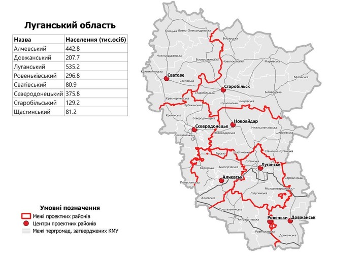 Луганський район (з адміністративним центром у місті Луганськ) у складі територій Луганської міської, Лутугинської міської, Молодогвардійської міської територіальних громад, затверджених Кабінетом Міністрів України;
