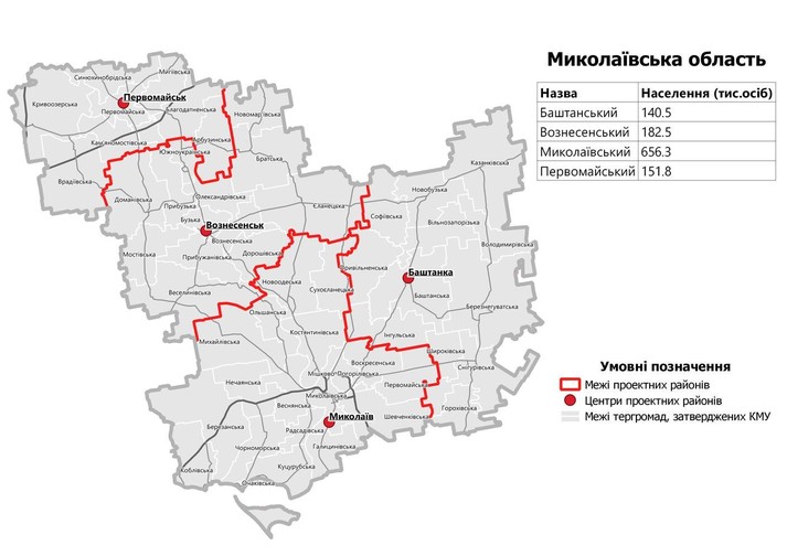 Первомайський район (з адміністративним центром у місті Первомайськ) у складі територій Арбузинської селищної, Благодатненської сільської, Врадіївської селищної, Кам’яномостівської сільської, Кривоозерської селищної, Мигіївської сільської, Первомайської міської, Синюхинобрідської сільської територіальних громад, затверджених Кабінетом Міністрів України;