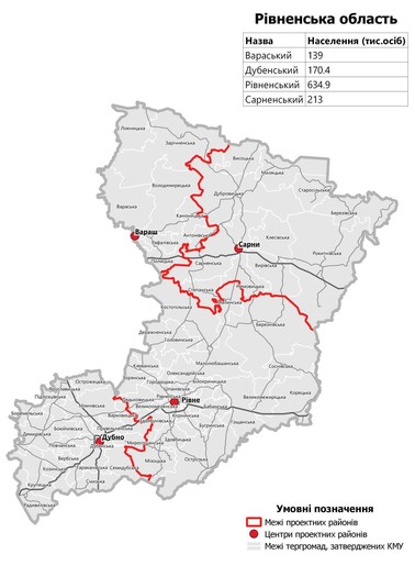 Рівненський район (з адміністративним центром у місті Рівне) у складі територій Бабинської сільської, Березнівської міської, Білокриницької сільської, Бугринської сільської, Великомежиріцької сільської, Великоомелянської сільської, Головинської сільської, Городоцької сільської, Гощанської селищної, Деражненської сільської, Дядьковицької сільської, Здовбицької сільської, Здолбунівської міської, Зорянської сільської, Клеванської селищної, Корецької міської, Корнинської сільської, Костопільської міської, Малинської сільської, Малолюбашанської сільської, Мізоцької селищної, Олександрійської сільської, Острозької міської, Рівненської міської, Соснівської селищної, Шпанівської сільської територіальних громад, затверджених Кабінетом Міністрів України;