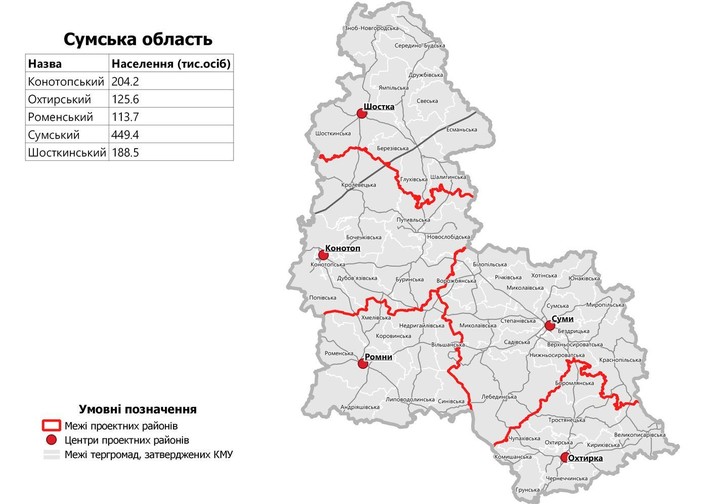 Охтирський район (з адміністративним центром у місті Охтирка) у складі територій Боромлянської сільської, Великописарівської селищної, Грунської сільської, Кириківської селищної, Комишанської сільської, Охтирської міської, Тростянецької міської, Чернеччинської сільської, Чупахівської селищної територіальних громад, затверджених Кабінетом Міністрів України;