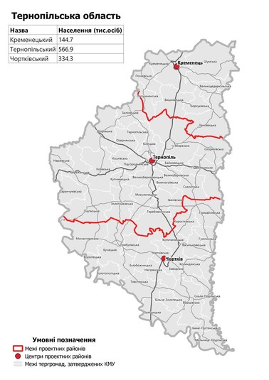 Тернопільський район (з адміністративним центром у місті Тернопіль) у складі територій Байковецької сільської, Бережанської міської, Білецької сільської, Великоберезовицької селищної, Великобірківської селищної, Великогаївської сільської, Залозецької селищної, Збаразької міської, Зборівської міської, Золотниківської сільської, Іванівської сільської, Козівської селищної, Козлівської селищної, Купчинецької сільської, Микулинецької селищної, Нараївської сільської, Озернянської сільської, Підволочиської селищної, Підгаєцької міської, Підгороднянської сільської, Саранчуківської сільської, Скалатської міської, Скориківської сільської, Теребовлянської міської, Тернопільської міської територіальних громад, затверджених Кабінетом Міністрів України;