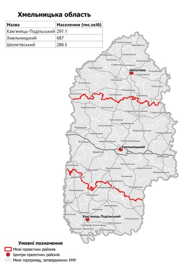 Шепетівський район (з адміністративним центром у місті Шепетівка) у складі територій Берездівської сільської, Білогірської селищної, Ганнопільської сільської, Грицівської селищної, Ізяславської міської, Крупецької сільської, Ленковецької сільської, Михайлюцької сільської, Нетішинської міської, Плужненської сільської, Полонської міської, Понінківської селищної, Сахновецької сільської, Славутської міської, Судилківської сільської, Улашанівської сільської, Шепетівської міської Ямпільської селищної, територіальних громад, затверджених Кабінетом Міністрів України.