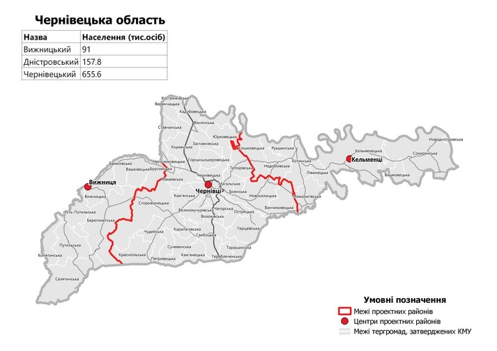 Чернівецький район (з адміністративним центром у місті Чернівці) у складі територій Боянської сільської, Ванчиковецької сільської, Великокучурівської сільської, Веренчанської сільської, Вікнянської сільської, Волоківської сільської, Герцаївської міської, Глибоцької селищної, Горішньошеровецької сільської, Заставнівської міської, Кадубовецької сільської, Кам’янецької сільської, Кам’янської сільської, Карапчівської сільської, Кіцманської міської, Кострижівської селищної, Красноїльської селищної, Магальської сільської, Мамаївської сільської, Неполоковецької селищної, Новоселицької міської, Острицької сільської, Петровецької сільської, Ставчанської сільської, Сторожинецької міської, Сучевенської сільської, Тарашанської сільської, Тереблеченської сільської,Топорівської сільської, Чагорської сільської, Чернівецької міської, Чудейської сільської, Юрковецької сільської територіальних громад, затверджених Кабінетом Міністрів України.