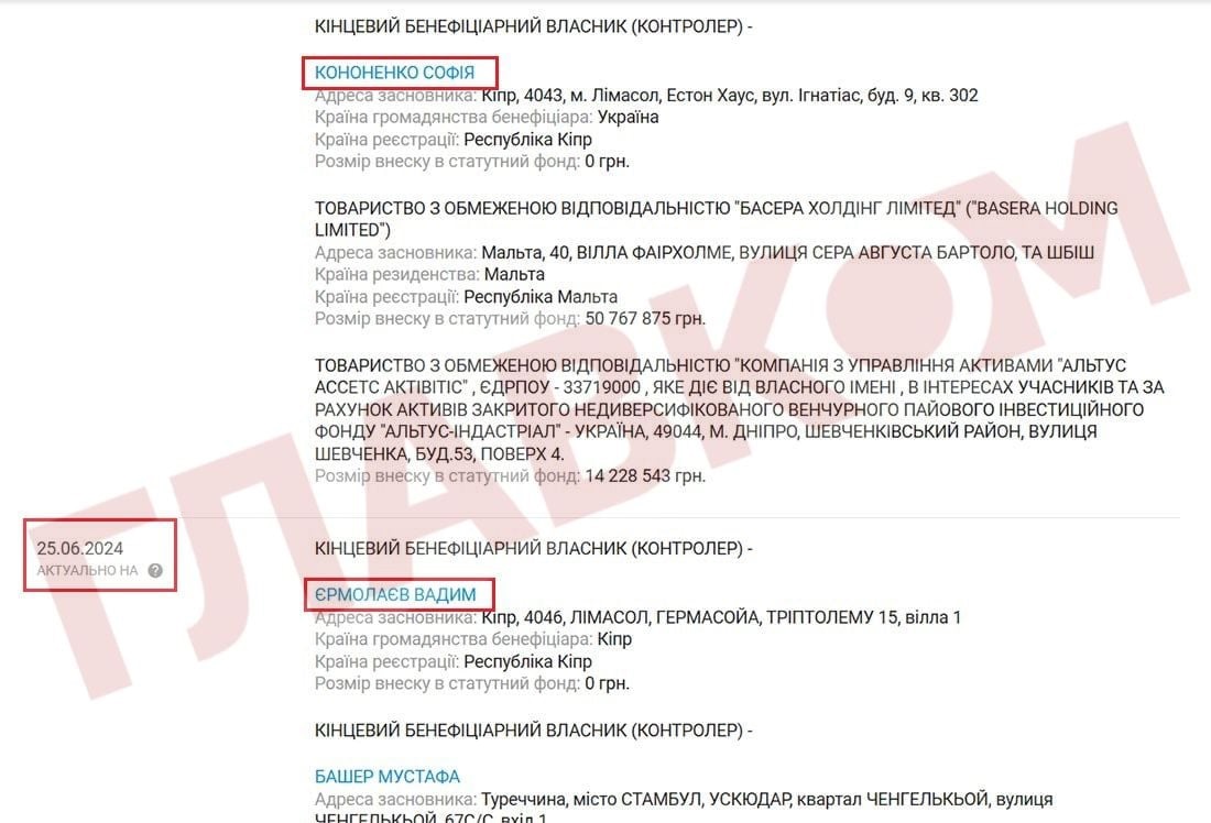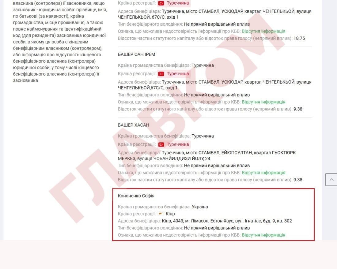 Разом із тим, за відомостями аналітичної системи Youcontrol, кінцевими бенефіціарами ТОВ «Аксор Індастрі» записано трьох громадян Туреччини Мустафу Башера, Хасана Башера, Ірема Оана Башера і громадянку України Софію Кононенко. Кононенко володіє контрольною часткою статутного капіталу фірми – 51,99%.