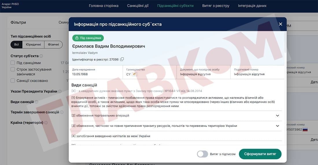 Термін дії санкцій стосовно Єрмолаєва – до червня 2034 року.