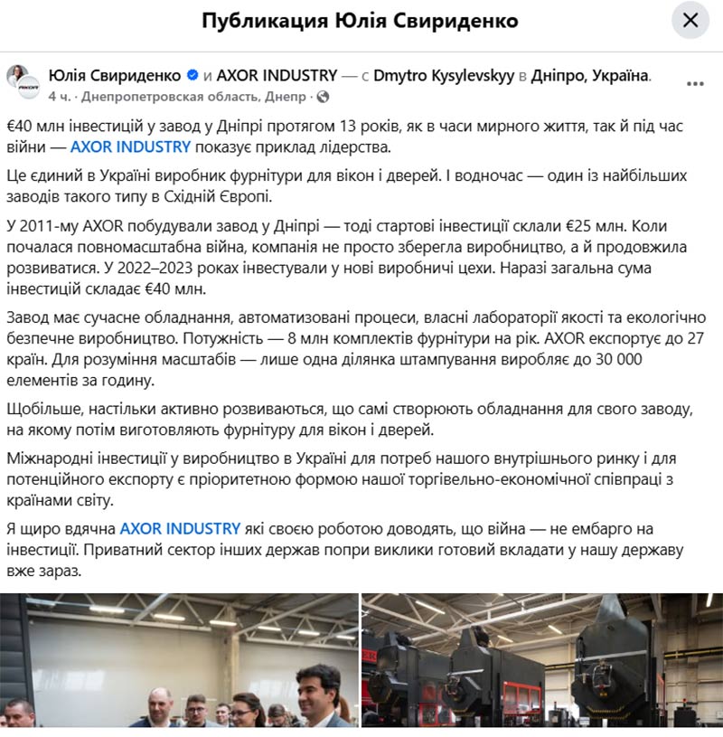 «Я щиро вдячна Axor Industry, які своєю роботою доводять, що війна – не ембарго на інвестиції. Приватний сектор інших держав попри виклики готовий вкладати у нашу державу вже зараз», – наголосила перша віцепрем’єрка.