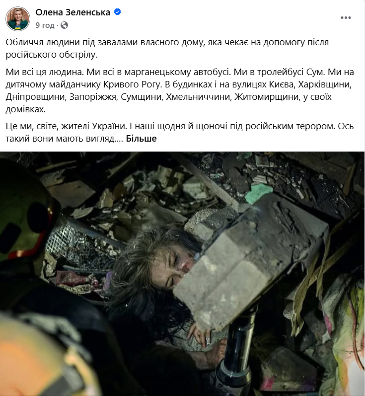 «Обличчя людини під завалами власного дому, яка чекає на допомогу після російського обстрілу. Ми всі ця людина. Ми всі в марганецькому автобусі. Ми в тролейбусі Сум. Ми на дитячому майданчику Кривого Рогу. В будинках і на вулицях Києва, Харківщини, Дніпровщини, Запоріжжя, Сумщини, Хмельниччини, Житомирщини, у своїх домівках», – написала Олена Зеленська у підписі до фото.