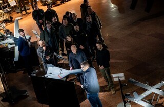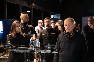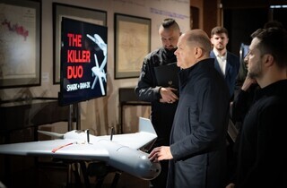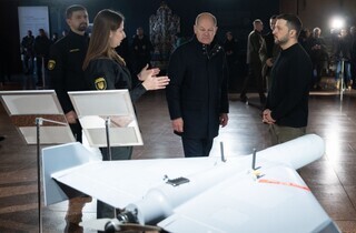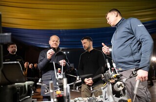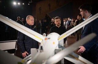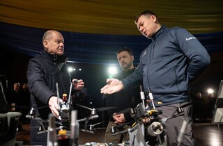 Президент України Володимир Зеленський і федеральний канцлер Німеччини Олаф Шольц у Києві оглянули новітні зразки виробів із системами автоматичного виявлення та ураження цілей, зокрема безпілотники, FPV-дрони, наземні роботизовані комплекси та систему керування «рою дронів». Про це йдеться на сайті Офісу президента.