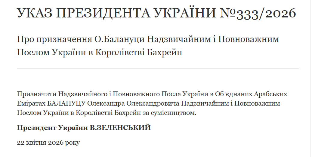 Президент України Володимир Зеленський підписав указ про нове дипломатичне призначення. Згідно з указом №333/2026, Олександр Балануца призначений надзвичайним і повноважним послом України в Королівстві Бахрейн за сумісництвом, пише «Главком».