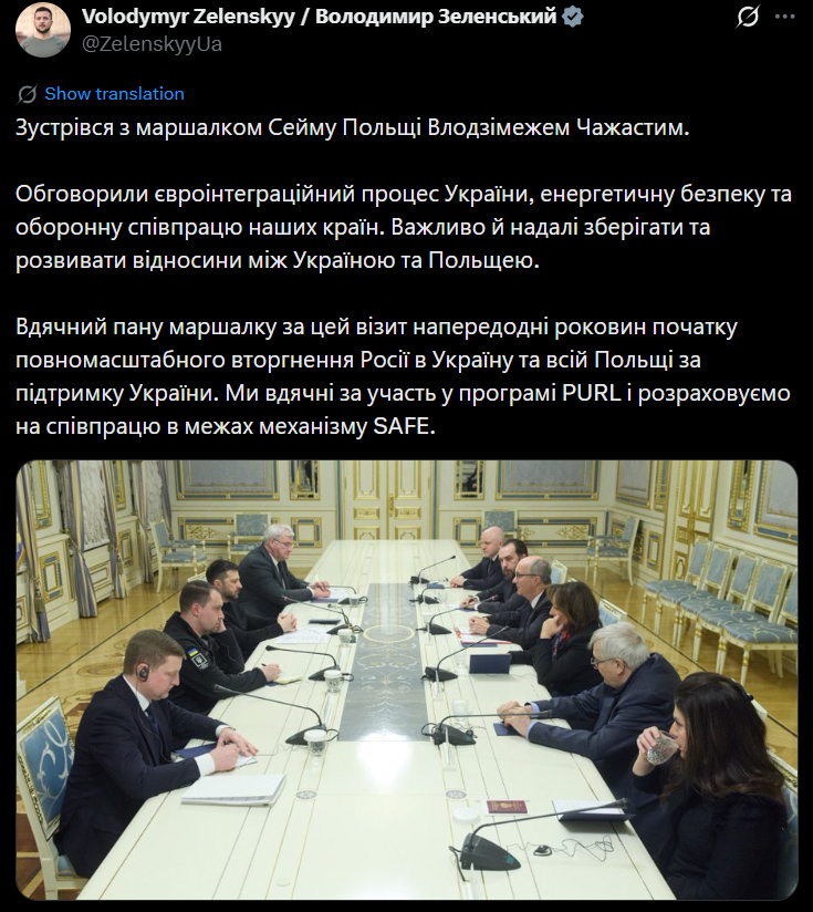 «Важливо й надалі зберігати та розвивати відносини між Україною та Польщею. Вдячний пану маршалку за цей візит напередодні роковин початку повномасштабного вторгнення Росії в Україну та всій Польщі за підтримку України. Ми вдячні за участь у програмі PURL і розраховуємо на співпрацю в межах механізму SAFE», – написав Зеленський.