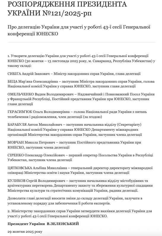 Президент України Володимир Зеленський підписав розпорядження про створення делегації України для участі в роботі 43-ї сесії Генеральної конференції ЮНЕСКО. Вона проходитиме з 30 жовтня до 13 листопада в Узбекистані. Про це повідомляє «Главком» з посиланням на розпорядження №121/2025-рп.