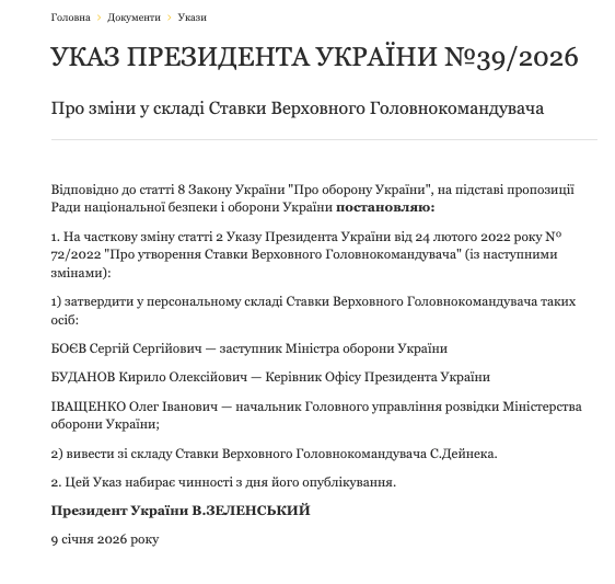 Президент України Володимир Зеленський підписав указ про оновлення складу Ставки верховного головнокомандувача. Про це йдеться в указі глави держави №39/2026.