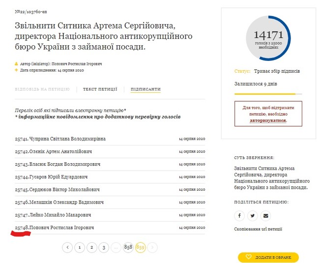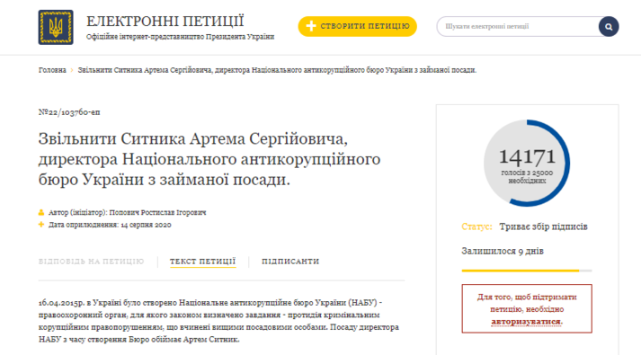 Йдеться про петицію на сайті Президента №22/103760-еп «Звільнити Ситника Артема Сергійовича, директора Національного антикорупційного бюро України з займаної посади». Станом на сьогодні зареєстровано 25 748 тих, хто підписав петицію. Цього достатньо для розгляду петиції Президентом України згідно з нормами чинного законодавства (петиція розглядається президентом, якщо вона набрала 25 тисяч підписів). Однак зараховано лише 14 171 голосів, тобто лише близько половини. З іншими петиціями на сайті Президента такого раніше ніколи не відбувалось.