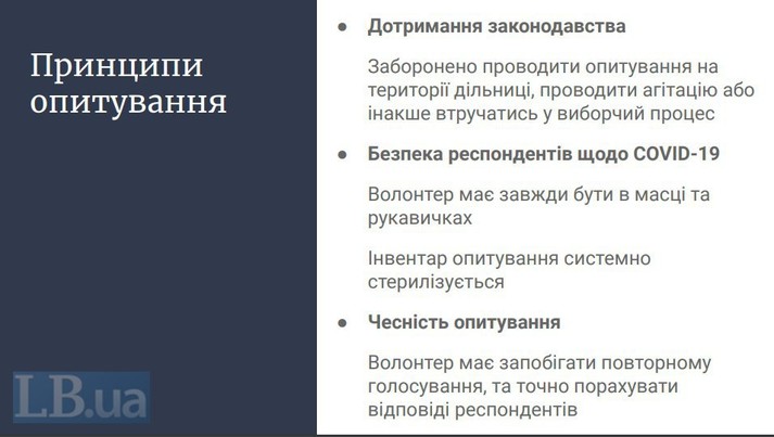 Опитування виключає будь-яку агітацію, та проводиться виключно серед охочих. Виборець отримує та заповнює анкету і опускає у коробку для опитування.