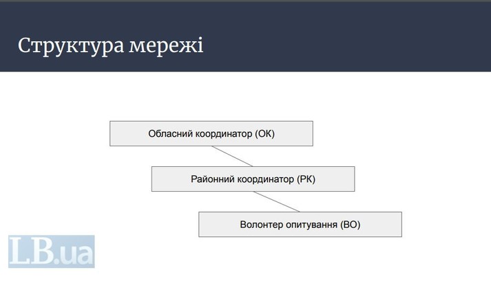 Структура мережі опитування включатиме обласних координаторів, регіональних координаторів та волонтерів опитування.