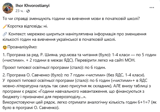 Керівник Офісу впровадження реформи Нової української школи при Міністерстві освіти та науки Ігор Хворостяний спростував інформацію про скорочення кількості годин української мови у початковій школі з 7 до 6 на тиждень. Про це повідомляє «Главком» з посиланням на його допис у соцмережі.