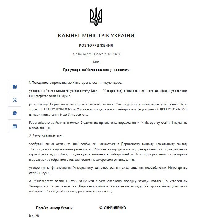 Відповідне розпорядження уряд підписав 6 березня 2026 року №215-р. Згідно з документом, Кабмін погодився з пропозицією Міністерства освіти і науки щодо утворення нового закладу вищої освіти – Ужгородського університету.