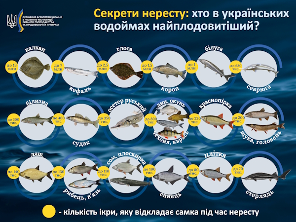Більшість видів риб в Україні мають надзвичайно високий репродуктивний потенціал, що дозволяє компенсувати значну смертність потомства на ранніх етапах розвитку. Кількість ікри, яку відкладає самка, може сягати мільйонів і суттєво різниться залежно від виду та умов середовища. Про це повідомляє «Главком» з посиланням на Державне агентство меліорації та рибного господарства України.
