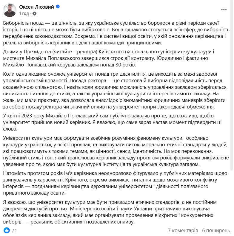«Днями у президента (читайте – ректора) Київського національного університету культури і мистецтв Михайла Поплавського завершився строк дії контракту. Юридично і фактично Михайло Поплавський керував закладом понад 30 років. Коли одна людина очолює університет понад три десятиліття, це виходить за межі здорової управлінської змінюваності», – йдеться у дописі.