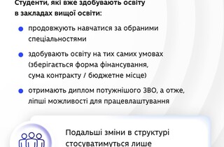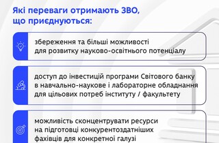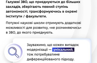 «Заклади, які приєднуються до більших ЗВО, зберігають певний ступінь автономності, трансформуючись в окремі інститути чи факультети. Наукові школи отримують додаткові можливості для розвитку, «не розчиняючись» у виші, до якого приєднуються», – повідомив Оксен Лісовий.