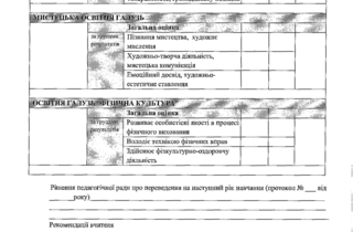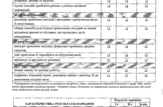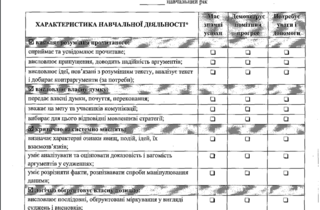 - Характеристика навчальної діяльності – тут учителі оцінюють рівень сформованості наскрізних умінь в учня / учениці наприкінці навчального року. Йдеться про розуміння прочитаного, висловлення власної думки, критичне і системне мислення, ініціативність тощо.