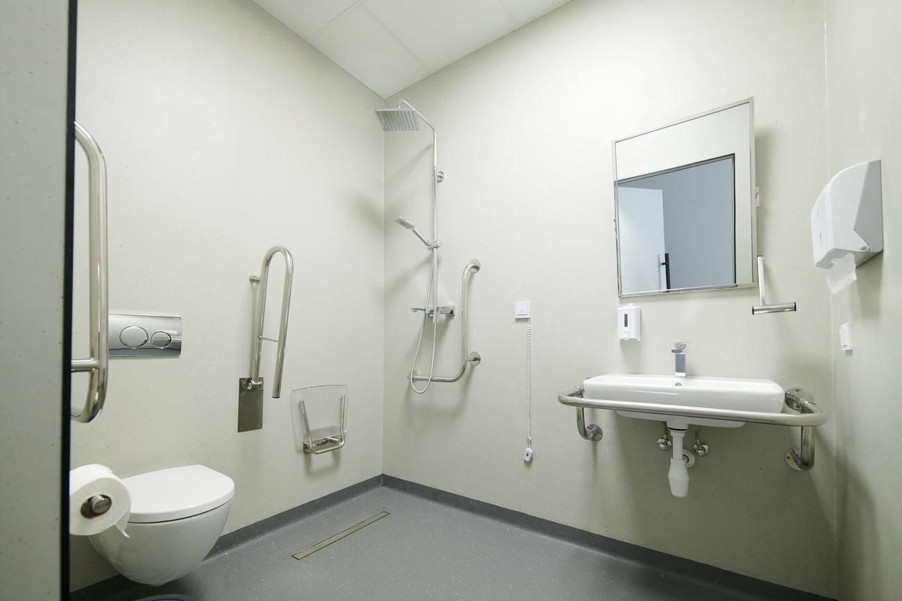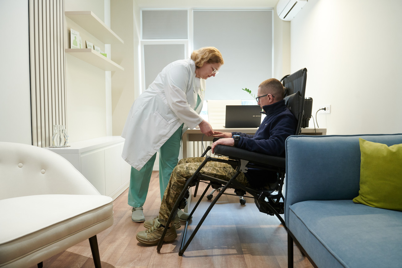 Житомирський центр «Повернення» – це кабінети для індивідуальної та сімейної терапії, зала групової терапії, двомісна палата денного стаціонару з медичними функціональними ліжками, маніпуляційний кабінет, рецепція із зоною очікування, а також службові приміщення для персоналу. Простір повністю інклюзивний – із широкими дверними отворами, відсутністю порогів та санітарними вузлами, адаптованими для людей на кріслах колісних.