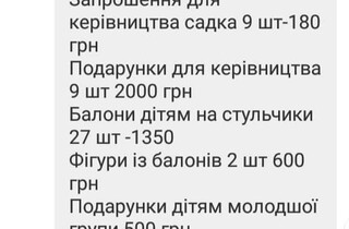 Організатори випускного в дитсадку пропонували зібрати: 2000 грн – на подарунки керівництву дитсадка, 180 грн – на запрошення керівництву, 1350 грн – на повітряні кульки дітям і ще 600 грн – на дві фігури з тих самих повітряних кульок. А ще 1600 грн – на відеозйомку, 500 грн – на подарунки дітям молодшої групи, по 50 грн – на медові пряники-медальки. І ще на килим для дитячого садка і подарунки вихователям. Загалом виходить у середньому по 5 тис. грн із дитини. Ініціатор такого «фінансування випускного» в чаті написав, що список потреб нібито було складено після спілкування з вихователями садка.