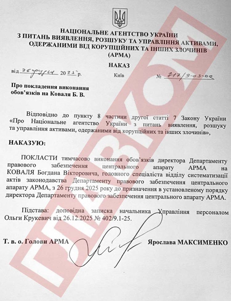 Наказ від 26 грудня про покладення на Богдана Коваля обов’язків керівника юридичного департаменту підписала т.в.о. голови АРМА Ярослава Максименко.