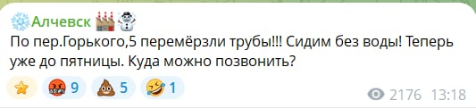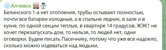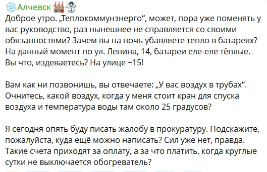 — ГЛАВКОМ (@GLAVCOM_UA) January 21, 2026Як пишуть місцеві канали, за словами мешканців Алчевська, по всьому місту фіксують пориви та аварії на теплотрасах. «Бригади не встигають усувати аварії. У квартирі особисто в мене +13-14 градусів, у другій кімнаті +11-12 градусів. Опалюємо електричними обігрівачами та побутовим газом. Напруга в мережі падає, проводка не витримує навантажень. У школах ситуація аналогічна, дуже холодно. Діти на уроках у верхньому одязі, уроки по 30 хвилин», – пише мешканка Алчевська.