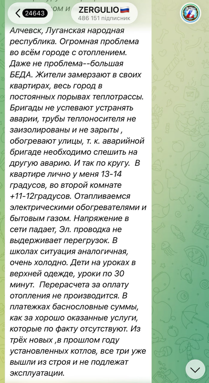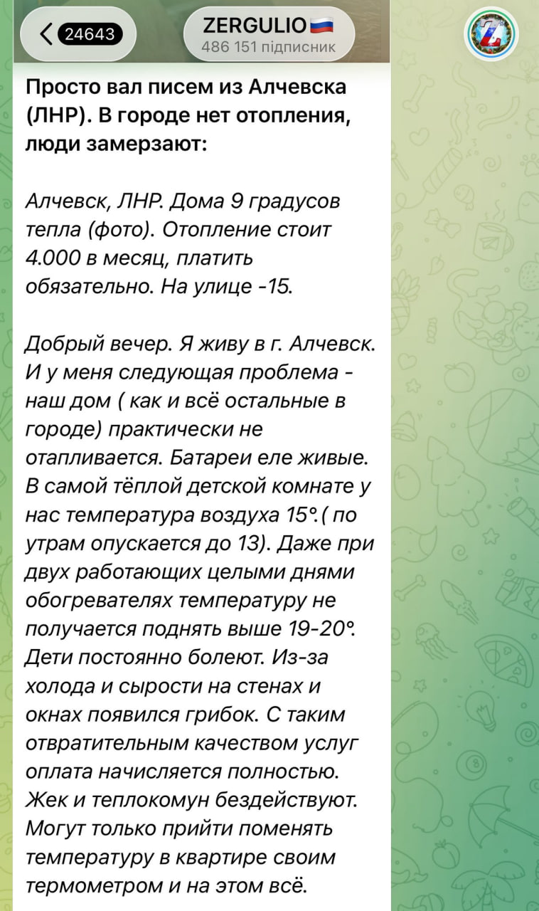 Ситуація в тимчасово окупованому Алчевську описують у Telegram-каналах. Водночас цю інформацію поширюють місцеві канали та пропагандистські блогери, а російські медіа замовчують ситуацію. Згідно із цими джерелами, місто залишається без постачання опалення. Причина – брудна вода, яка забила системи опалення. Через що труби рвуться та їх псує корозія.