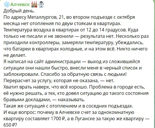 Місто Алчевськ Луганської області перебуває на шляху до повторення гуманітарної катастрофи через відсутність роботи систем опалення. Місто, яке перебуває під тимчасовою окупацією російських військ із 2014 року, наразі живе без опалення в сильні морози, що охопили Україну.… pic.twitter.com/tZFjTfXd3d