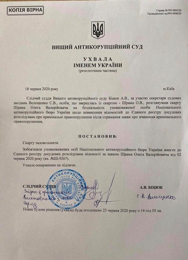 Зазначається, що ухвалу винесено після розгляду скарги позивача Олега Шрама на бездіяльність НАБУ.
