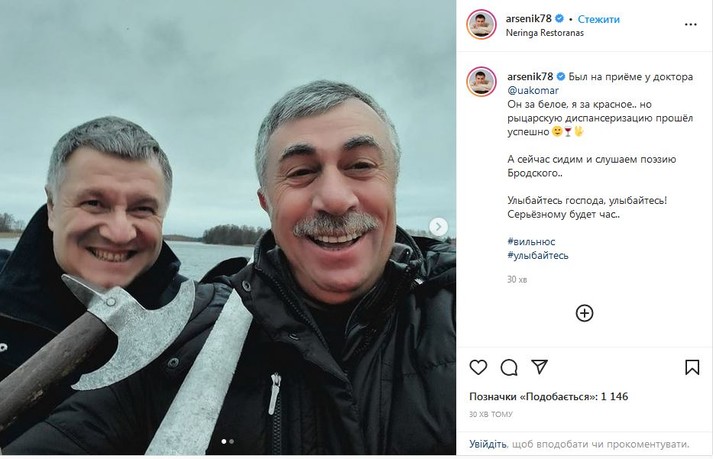 Колишній міністр внутрішніх справ Арсен Аваков опублікував декілька фото з відомим лікарем Євгеном Комаровським і залишив філософський підпис. Вони разом провели час у Литві, де проходив форум «Майбутнє демократії».