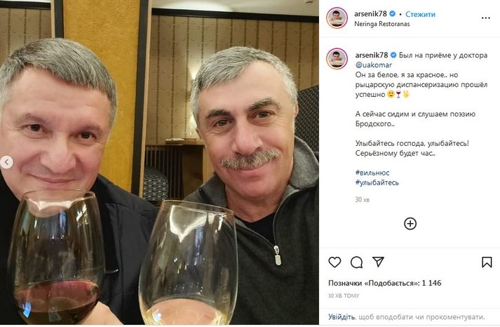 «Був у доктора Євгена Комаровського. Лицарську диспансерізацію успішно завершено. А тепер сидимо і слухаємо поезію Бродського. Посміхніться панове, посміхайтеся! На серйозне буде час…», – написав Аваков.