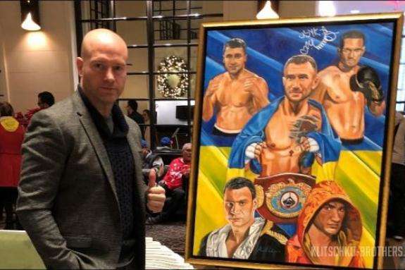 Художник Пет Кілліан намалював картину із видатними українськими художниками і презентував її перед боєм Ломаченка-Педраса. Про це повідомляє офіційний фан-клуб братів Кличко.