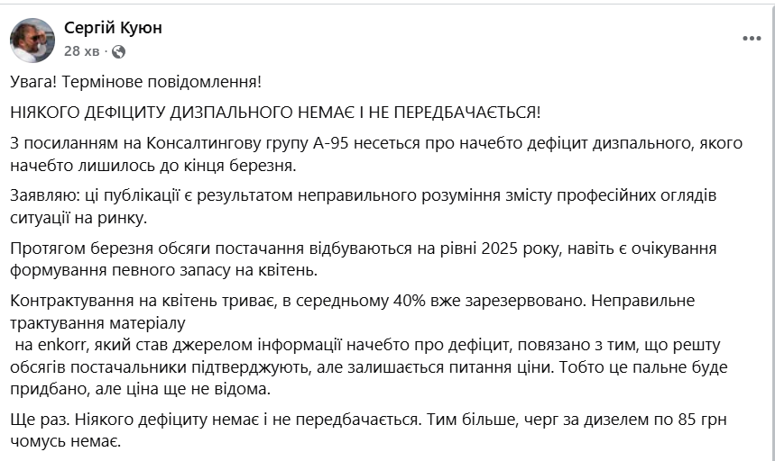 «З посиланням на консалтингову групу А-95 несеться про начебто дефіцит дизпального, якого начебто лишилось до кінця березня. Заявляю: ці публікації є результатом неправильного розуміння змісту професійних оглядів ситуації на ринку», – йдеться у дописі.