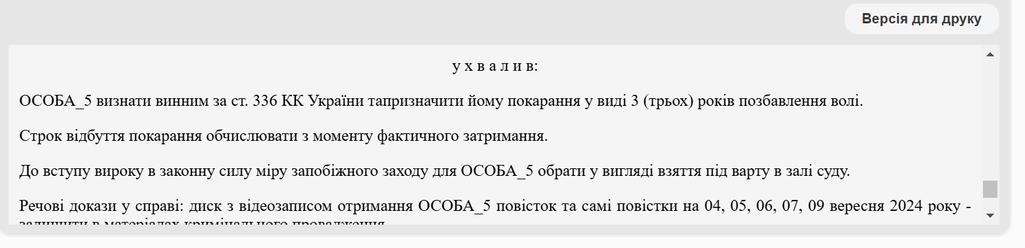 За даними суду, чоловіка в липні 2024 року визнали придатним до мобілізації. У вересні він отримав п’ять повісток, проте жодного разу не прибув до ТЦК для відправлення на військову службу.