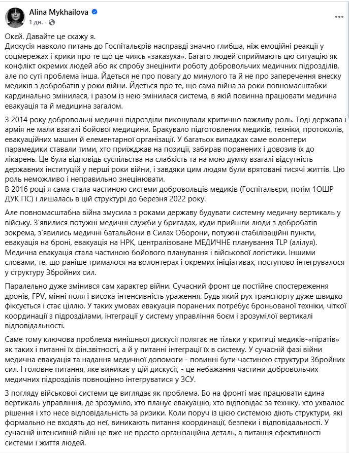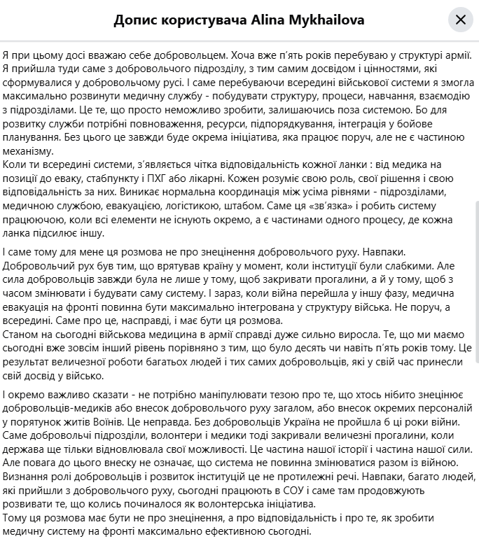 «З 2014 року добровольчі медичні підрозділи виконували критично важливу роль. Тоді держава і армія не мали взагалі бойової медицини. Бракувало підготовлених медиків, техніки, протоколів, евакуаційних машин й елементарної організації. У багатьох випадках саме волонтери парамедики ставали тими, хто приїжджав на позиції, забирав поранених і довозив їх до лікарень. Це була відповідь суспільства на слабкість та на мою думку взагалі відсутність державних інституцій у перші роки війни, і завдяки цим людям були врятовані тисячі життів. Цю роль неможливо і неправильно знецінювати», – йдеться у дописі.