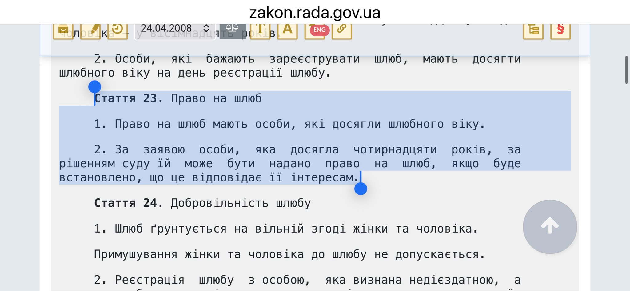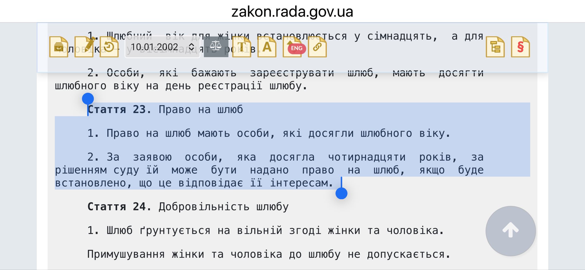 Свої слова Ігор Фріс підтвердив скриншотом з сайту Верховної Ради України. «За заявою особи, яка досягла чотирнадцяти років, за рішенням суду їй може бути надано право на шлюб, якщо буде встановлено, що це відповідає її інтересам», – йдеться у статті.