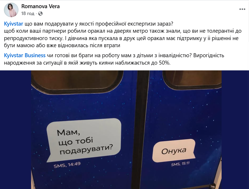 «Kyivstar, що вам подарувати у якості професійної експертизи зараз? Щоб коли ваші партнери робили оракал на дверях метро також знали, що ви не толерантні до репродуктивного тиску. І дівчина, яка пускала в друк цей оракал, має підтримку у її рішенні не бути мамою або вже відновилась після втрати», – написала Романова.
